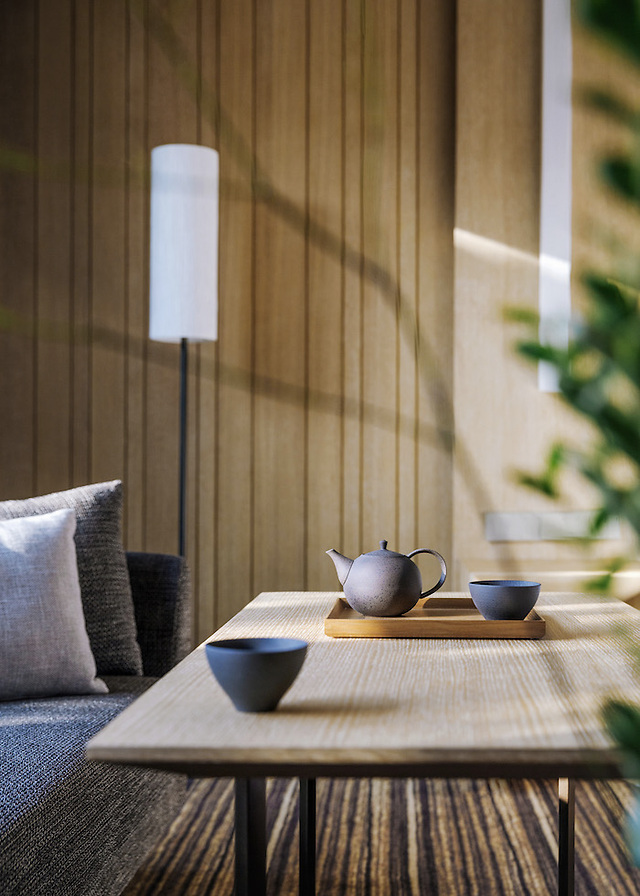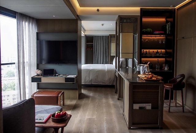 酒店建筑以传统中式住宅“三合院”为设计灵感,“回归自然”的设计理念从清新的户外公园一直延伸至色彩温暖的室内。东方独特禅意美学和回归自然设计理念也延伸到了348间客房,柔和的橡木、米色及绿色的大理石、木质纹理的地毯,都营造出繁华都市中的偏安一隅。