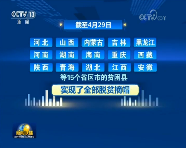 截至4月29日,我国已有河北、山西、内蒙古、吉林、黑龙江、河南、湖南、海南、重庆、西藏、陕西、青海、湖北、江西、安徽等15个省区市的贫困县实现了全部脱贫摘帽。