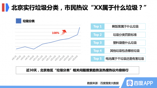 新版《北京市生活垃圾管理条例》于5月1日正式实施,面临垃圾分类大考的北京市民在关注着什么?百度搜索大数据显示,近7天,北京地区搜索垃圾分类相关问题热度环比上涨108%,其中剩饭菜属于什么垃圾、垃圾分类罚款标准、塑料袋属于什么垃圾等问题最受关注。北京市民通过搜索主动了解垃圾分类相关信息,垃圾分类的意识明显提升。