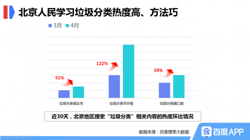 面对垃圾分类难题,北京市民有自己的小妙招。百度搜索大数据显示,近30天,北京地区垃圾分类手抄报、垃圾分类顺口溜、垃圾分类倡议书等搜索热度分别环比上涨了122%、59%、51%。这些老少皆宜、风趣好记的形式,让垃圾分类变得不再枯燥。