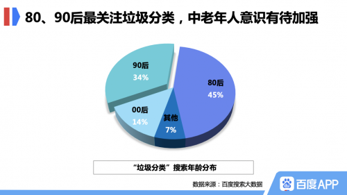 不同年龄段对于垃圾分类的态度也有很大差异。百度搜索大数据显示,搜索垃圾分类相关信息的人群中,80后用户占比最多,达到45%,90后用户占比34%排名第二,而40岁以上用户仅占7%。80、90后对于垃圾分类和环保的关注度明显更高,中老年人群的意识有待加强。
