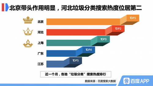 虽然此次垃圾分类新政只在北京实施,但北京的带头作用已经拉动了周边地区环保意识的提升。百度搜索大数据显示,近一个月全国各地垃圾分类搜索热度排名中,北京不出意外地位列第一,河北省紧随其后位列第二。近几年京津冀一体化发展迅猛,河北人民在提升垃圾分类意识方面也紧跟首都的步伐。