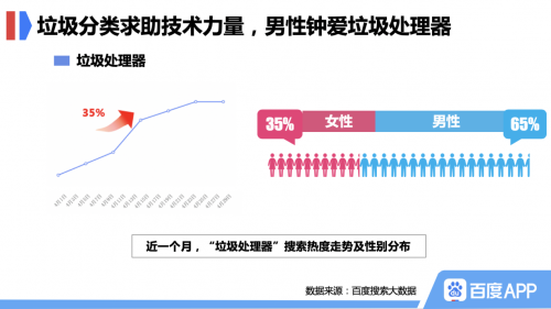 此外,不少用户在面对垃圾分类难题时选择求助科技的力量。在过去的一个月,垃圾处理器百度搜索热度环比上涨35%,是4月份搜索热度涨幅最大的商品之一,其中男性用户占到了65%。垃圾处理器可以将厨余垃圾打碎后冲入下水道,免去分类的烦恼,不少网友把垃圾处理器当做应对这次大考的一种捷径。
