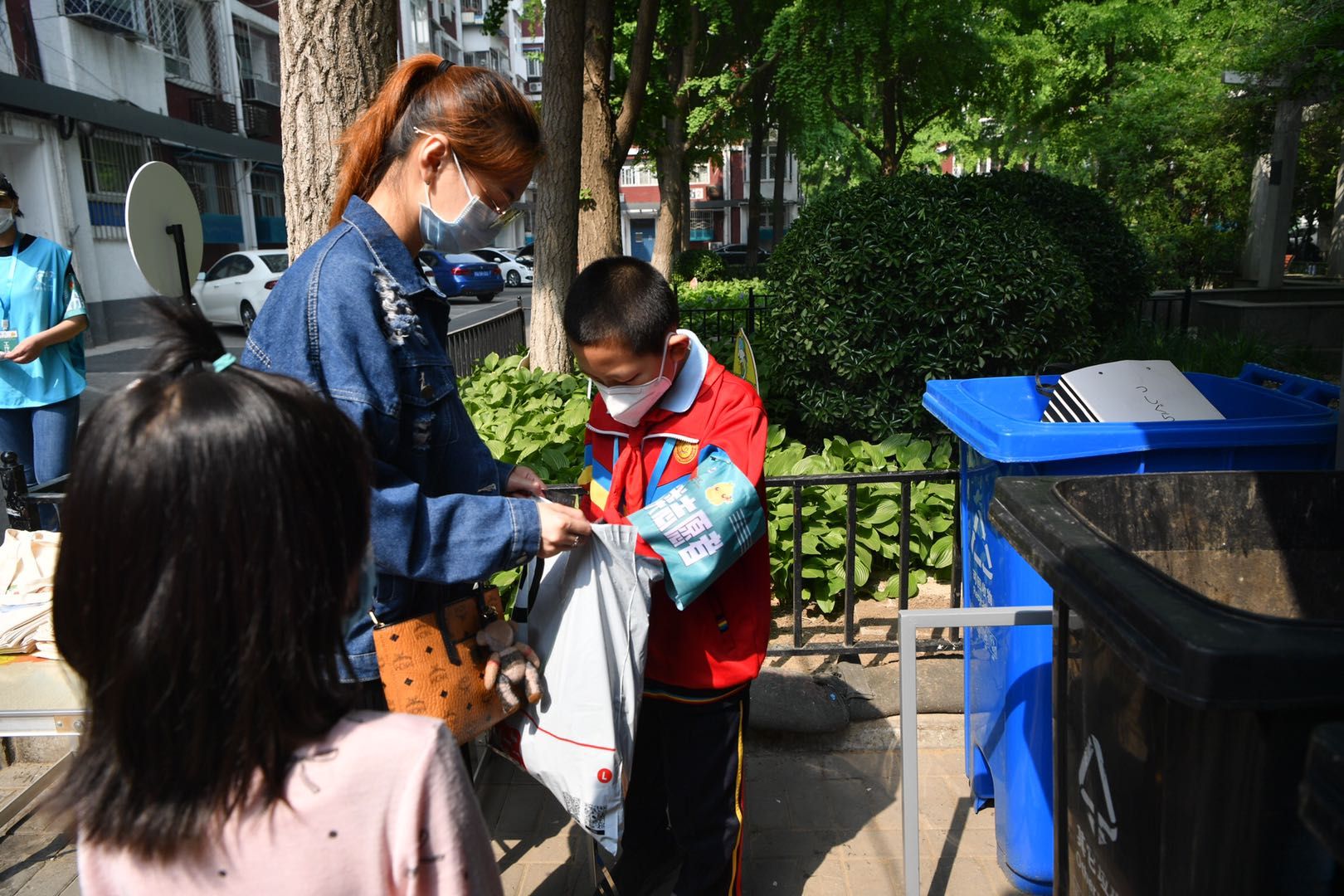 社区中除了“普通的”垃圾分类志愿者之外,还有带着孩子一家“齐上阵”的。
