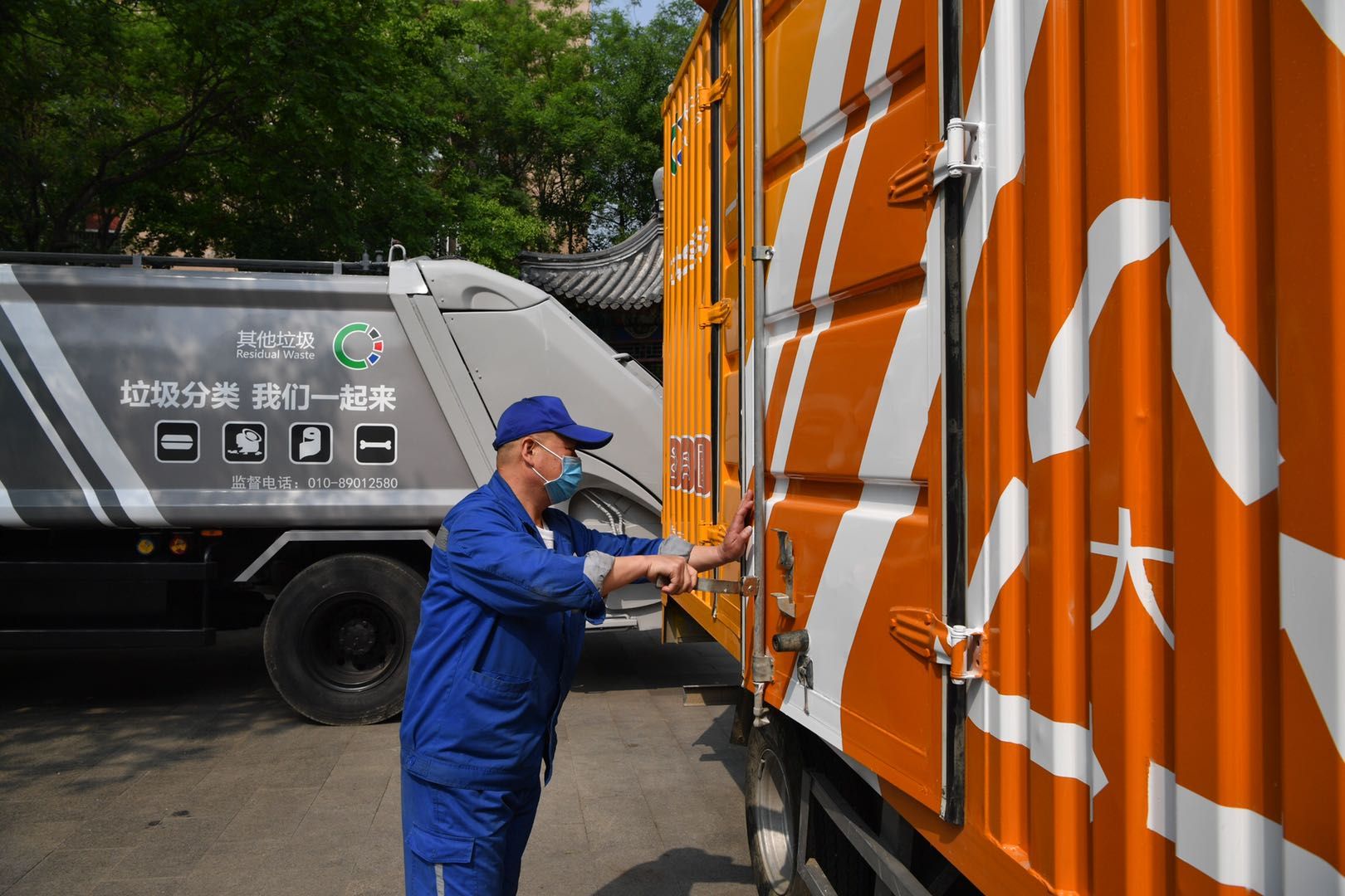 新喷涂垃圾分类车辆。摄 新京报记者 吴江