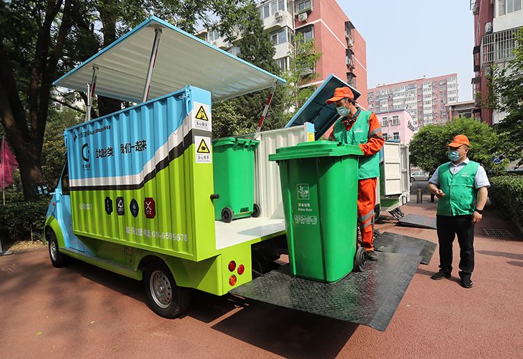 朝阳门街道,快递车上门取垃圾,居民电话预约回收、取件车上门取件、向居民支付费用、统一送到厢式货车集中外运,垃圾回收一条龙服务。