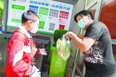 1日,在呼家楼北里社区,垃圾分类小志愿者正在引导居民进行垃圾分类。本报记者方非摄
