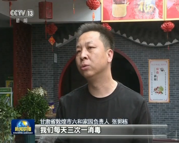 甘肃省敦煌市六和家园负责人 张郭栋:我们每天三次一消毒,每桌都有公筷公勺,现在我们把有些份量大的菜品实行分餐制,一人一份。