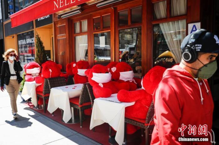 资料图:当地时间4月28日,美国纽约一家餐厅在室外餐位上放置戴口罩的玩偶吸引路人。中新社记者 廖攀 摄