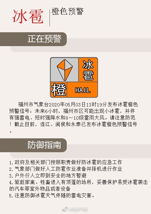 福州市气象台2020年05月03日13时19分发布冰雹橙色预警信号:未来6小时,福州市区可能出现小冰雹,并伴有强雷电、短时强降水和8~10级雷雨大风。请注意防范!截止目前,连江、闽侯和永泰已发布冰雹橙色预警信号。