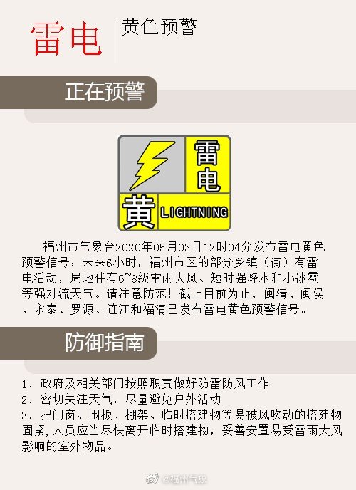 福州市气象台2020年05月03日12时04分发布雷电黄色预警信号:未来6小时,福州市区的部分乡镇(街)有雷电活动,局地伴有6~8级雷雨大风、短时强降水和小冰雹等强对流天气。请注意防范!截止目前为止,闽清、闽侯、永泰、罗源、连江和福清已发布雷电黄色预警信号。