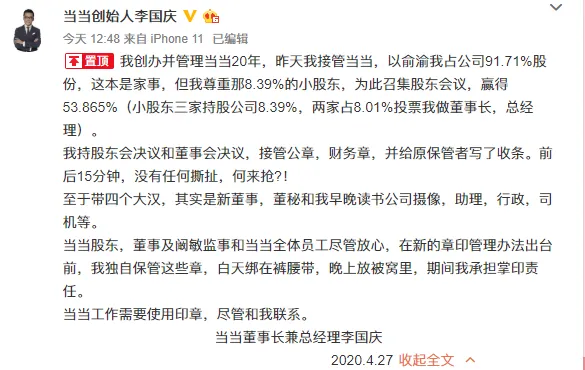 李国庆午间发布微博称,自己持股东会决议和董事会决议,接管公章,财务章,并给原保管者写了收条。前后15分钟,没有任何撕扯,何来抢?!至于带四个大汉,其实是新董事,董秘和我早晚读书公司摄像,助理,行政,司机等。 当当股东,董事及阚敏监事和当当全体员工尽管放心,在新的章印管理办法出台前,我独自保管这些章,李国庆称公章白天绑裤腰带晚上放被窝#,期间我承担掌印责任。