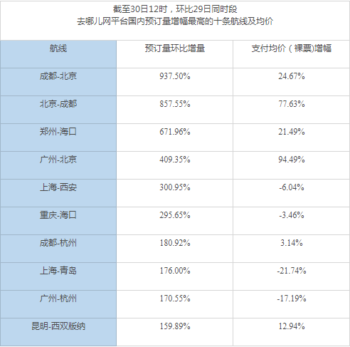 4月29日,据马蜂窝旅游大数据显示,马蜂窝平台上北京用户的酒店订单量较上周同期增长320%,与此同时,大量游客涌入马蜂窝搜索北京及周边相关的旅游信息;去哪儿的数据则显示,截至30日下午,京沪航线搜索热度排名第一;从出发地看,北京至上海、成都、三亚、重庆、广州均为“五一”期间的热门航线。