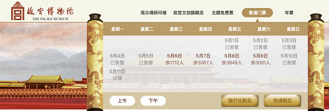 截至5月1日下午19:00,故宫官方网站显示,从5月1日至5月5日的门票已经全部售罄。有人告诉燃财经,本来准备去景山公园逛一逛,但门票预约也已经排到了5月5日。