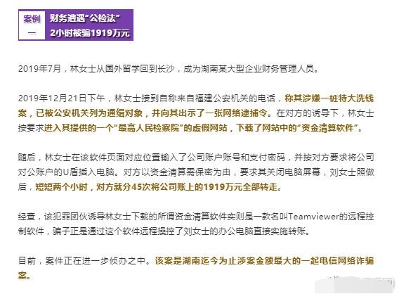 5月1日,长沙市公安局召开新闻通报会,通报了湖南历史上金额最大的一起电信网络诈骗案,金额高达1919万元。