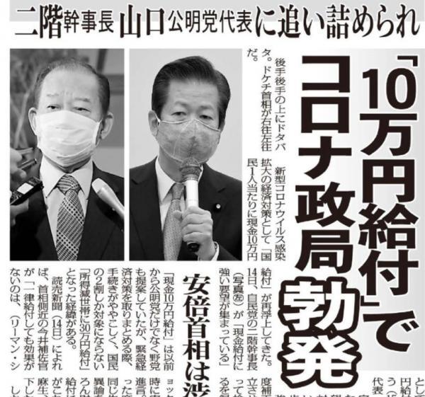 立宪民主党和日本共产党为首的在野党率先提出了全体国民一律补助10万补助金的方针,与当时自民党的仅针对贫困层补助30万日元的政策针锋相对。在这个关口,与自民党联手组阁、同为执政党的公民党党首山口那津男,以及自民党党内实力派、干事长二阶俊博联手,公开声称不赞成安倍的30万元贫困层补助措施,而是主张针对全体国民一律10万的补助方式。