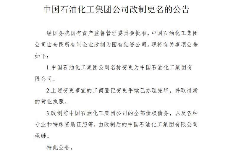 此次公布的《中国石油化工集团公司改制更名的公告》主要有三点内容,一是中国石油化工集团公司名称变更为中国石油化工集团有限公司;二是上述变更事宜的工商登记变更手续已办理完毕,并取得新的营业执照;三是改制前中国石油化工集团公司的全部债权债务,以及各种专业和特殊资质证照等,由改制后的中国石油化工集团有限公司承继。