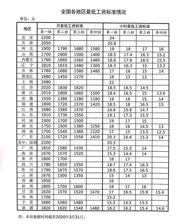 4月26日,人社部网站发布了全国最低工资标准。数据显示,截至今年3月底,北上广天津江苏浙江六个省份第一档月最低工资标准超过2000元。