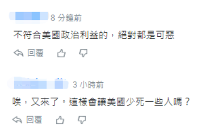 还有台湾网民不满表示,少找台湾当垫背。美国只会“甩锅”而已。美国政客很会说谎、抹黑。不符合美国政治利益的就是“可恶”。有网民则反问,又来了,这样会让美国少死些人吗?↓