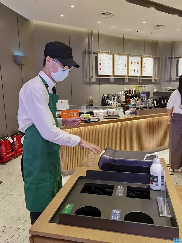 “咖啡渣、茶叶渣属于厨余垃圾;纸吸管、热杯、茶包袋、纸巾属于其他垃圾;洗净的塑料瓶、牛奶盒是可回收物;电池、灯泡属于有害垃圾。”一谈起垃圾分类, 店经理马骏脱口而出。