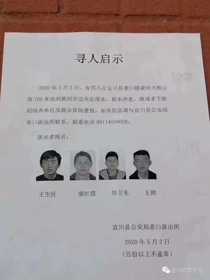 据宜川县政府通报:5月2日16点20分左右,陕西省延安市宜川县壶口镇昝家山村黄河大桥下游约700米处发生一起坠河事件,4人落水并被水冲走。