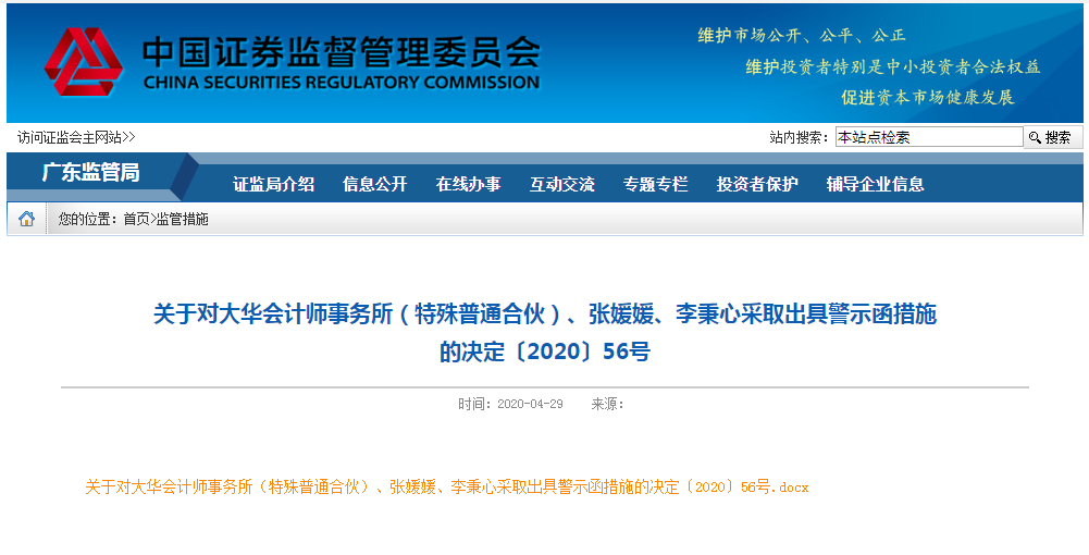4月29日,证监会广东监管局网站发布了《关于对大华会计师事务所(特殊普通合伙)、张媛媛、李秉心采取出具警示函措施的决定》。据介绍,广东证监局对TCL科技进行了现场检查,并对大华会计师事务所、张媛媛、李秉心执业的TCL科技2018年度审计工作进行了延伸检查,发现在审计执业中存在截止性测试程序执行不到位、细节测试程序执行不到位、分析性程序执行不到位、函证程序执行不到位四大问题。根据《上市公司信息披露管理办法》第六十五条的规定,广东证监局对其采取出具警示函的行政监管措施。