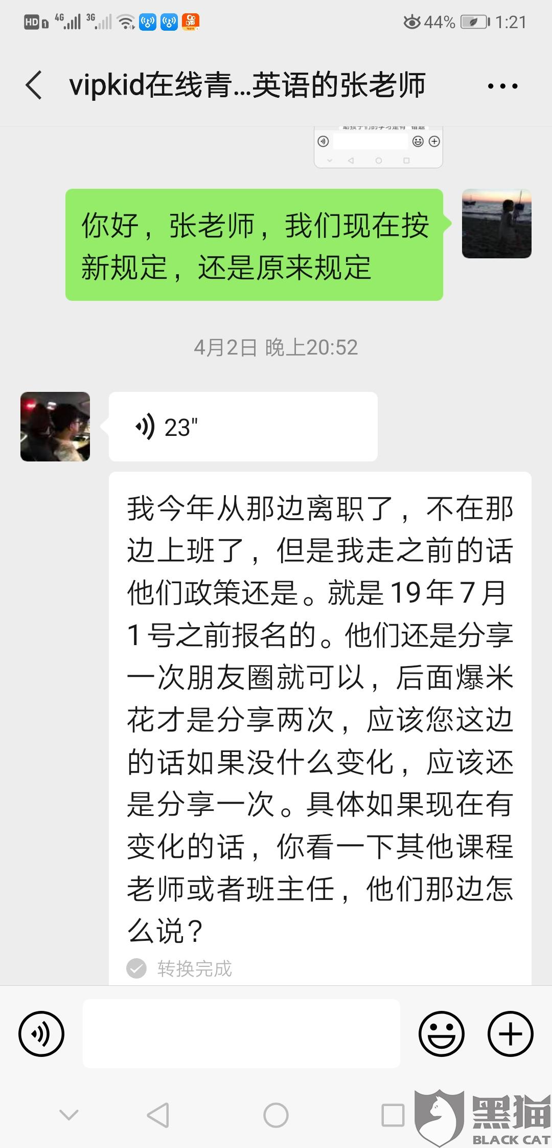 商家“VIPKID官微”4月6日在黑猫投诉平台回复:“亲爱的家长,您好,我们已经收到您的反馈,稍后会有客服人员联系您”