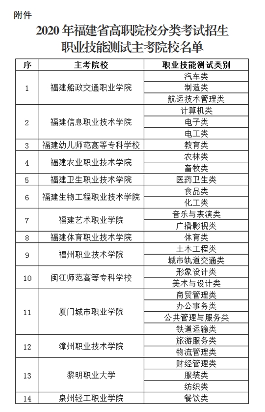 附件:2020年福建省高职院校分类考试招生职业技能测试主考院校名单