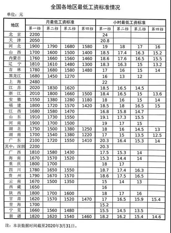 数据显示,截至2020年3月31日,上海、北京、广东、天津、江苏、浙江6省份的第一档月最低工资标准超过2000元。其中,上海最高为2480元。