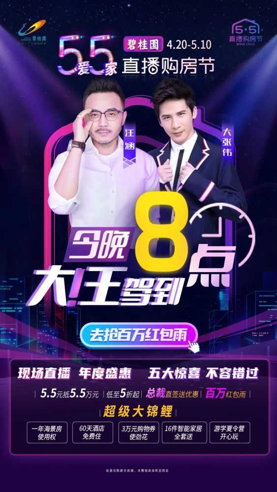 “流量明星”叠加“促销优惠”,房企使出“组合拳”。据碧桂园透露,将于5月5日晚上8:00,携手娱乐圈超级流量明星汪涵、大张伟,在碧桂园官方抖音账号上跨界直播购房,此次直播购房特惠将覆盖16省60多个城市的超3000套精品特惠房源,直播间将推出5.5元抵55000元购房神券、总裁直签特惠、百万红包雨等福利派不停。