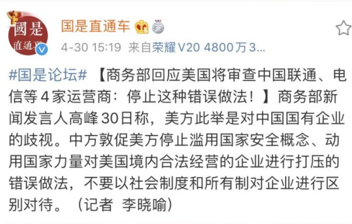 商务部新闻发言人高峰30日称,美方此举是对中国国有企业的歧视。中方敦促美方停止滥用国家安全概念、动用国家力量对美国境内合法经营的企业进行打压的错误做法,不要以社会制度和所有制对企业进行区别对待。(记者 李晓喻)