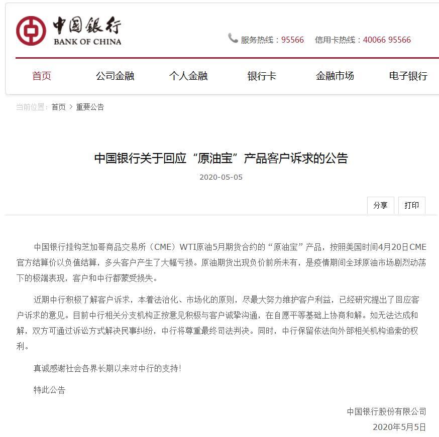 中新经纬客户端5月5日电 据中国银行官网消息,5日深夜,中国银行发布关于回应“原油宝”产品客户诉求的公告,公告称,目前中行相关分支机构正按意见积极与客户诚挚沟通,在自愿平等基础上协商和解。如无法达成和解,双方可通过诉讼方式解决民事纠纷,中行将尊重最终司法判决。