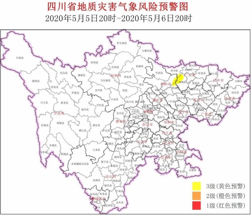 预警区域:广元剑阁县、青川县,绵阳梓潼县、江油市。