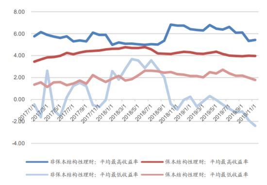 这也意味着,商品及衍生品类理财产品并非银行理财所擅长。根据华宝证券的数据,银行非保本结构性理财产品,平均最低收益率长期处于负收益区间(图5)。