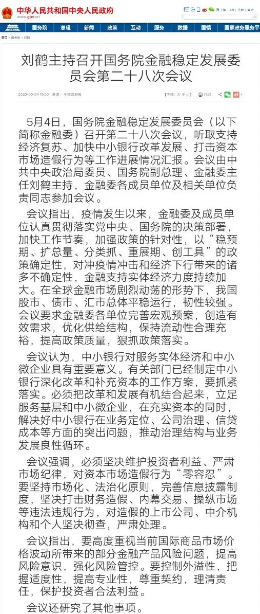 5月4日,国务院金融稳定发展委员会(以下简称金融委)召开第二十八次会议,听取支持经济复苏、加快中小银行改革发展、打击资本市场造假行为等工作进展情况汇报。会议由中共中央政治局委员、国务院副总理、金融委主任刘鹤主持,金融委各成员单位及相关单位负责同志参加会议。