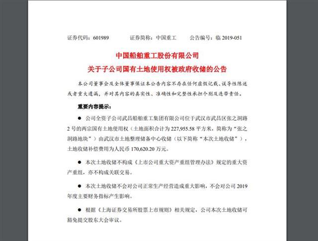 根据中国船舶重工股份有限公司官网发布的《中国船舶重工股份有限公司关于子公司国有土地使用权被政府收储的公告》(下简称“公告”):