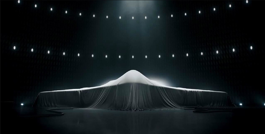 之前,美方也以幕布遮盖的方式公开过B-21模型。而航空工业宣传片中的新机与之比对,轮廓上有很大相同,比如新机的座舱轮廓更宽但高度较低,翼展更大。在进气方面,B-2A和B-21都采用背负式进气道,因为隐身战略轰炸机不强调超音速,而且背负式进气道的隐身效果更好。宣传片中的新机现在无法知晓是什么样的进气道,但从隐身角度考虑采用背负式进气道的可能性更大。