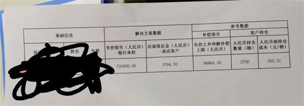 以上图片显示,该投资者持有2750桶原油,持仓成本是165.21元/桶,按照4月21日-266元/桶的结算价计,需承担穿仓费用731830元,这笔金额将由中行承担。中行退回3794.7元保证金,负价之外和解补偿上限是90865.5元。