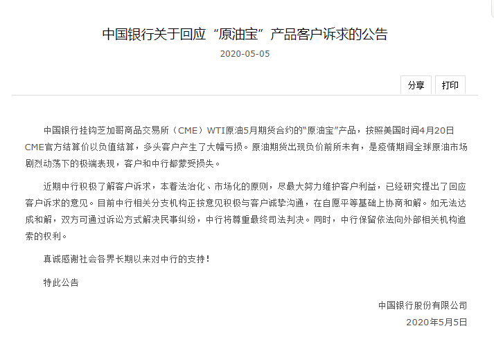 公告显示,目前中行相关分支机构正按意见积极与客户诚挚沟通,在自愿平等基础上协商和解。如无法达成和解,双方可通过诉讼方式解决民事纠纷,中行将尊重最终司法判决。