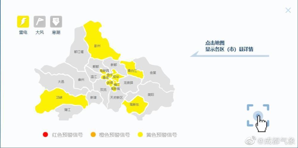 3月26日,成都市气象台21时30分发布雷电黄色预警信号:预计未来6小时内,成都市青白江区、金牛区、成华区、武侯区、锦江区、青羊区和高新东区的大部地方有雷雨,大风4-6级,个别地方大雨到暴雨,个别地方可能出现冰雹,请注意防范。
