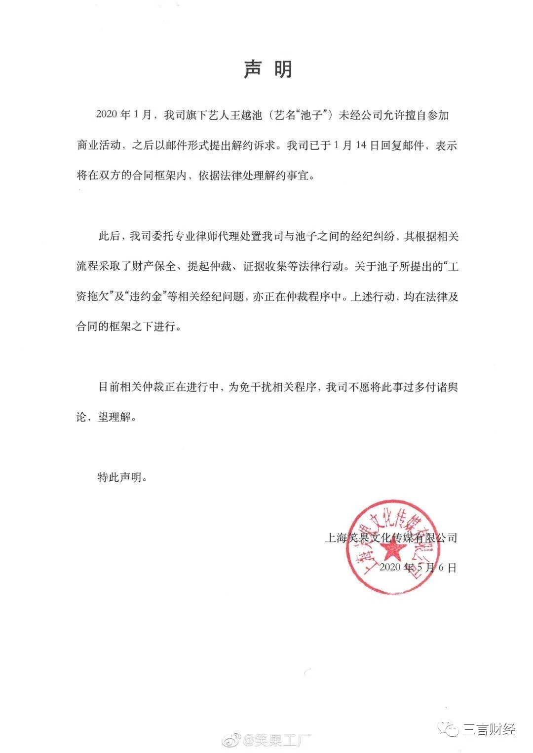 针对池子起诉一事,今日晚间,笑果文化发布声明称,2020年1月,我司旗下艺人王越池(艺名“池子”)未经公司允许擅自参加商业活动,之后以邮件形式提出解约诉求。