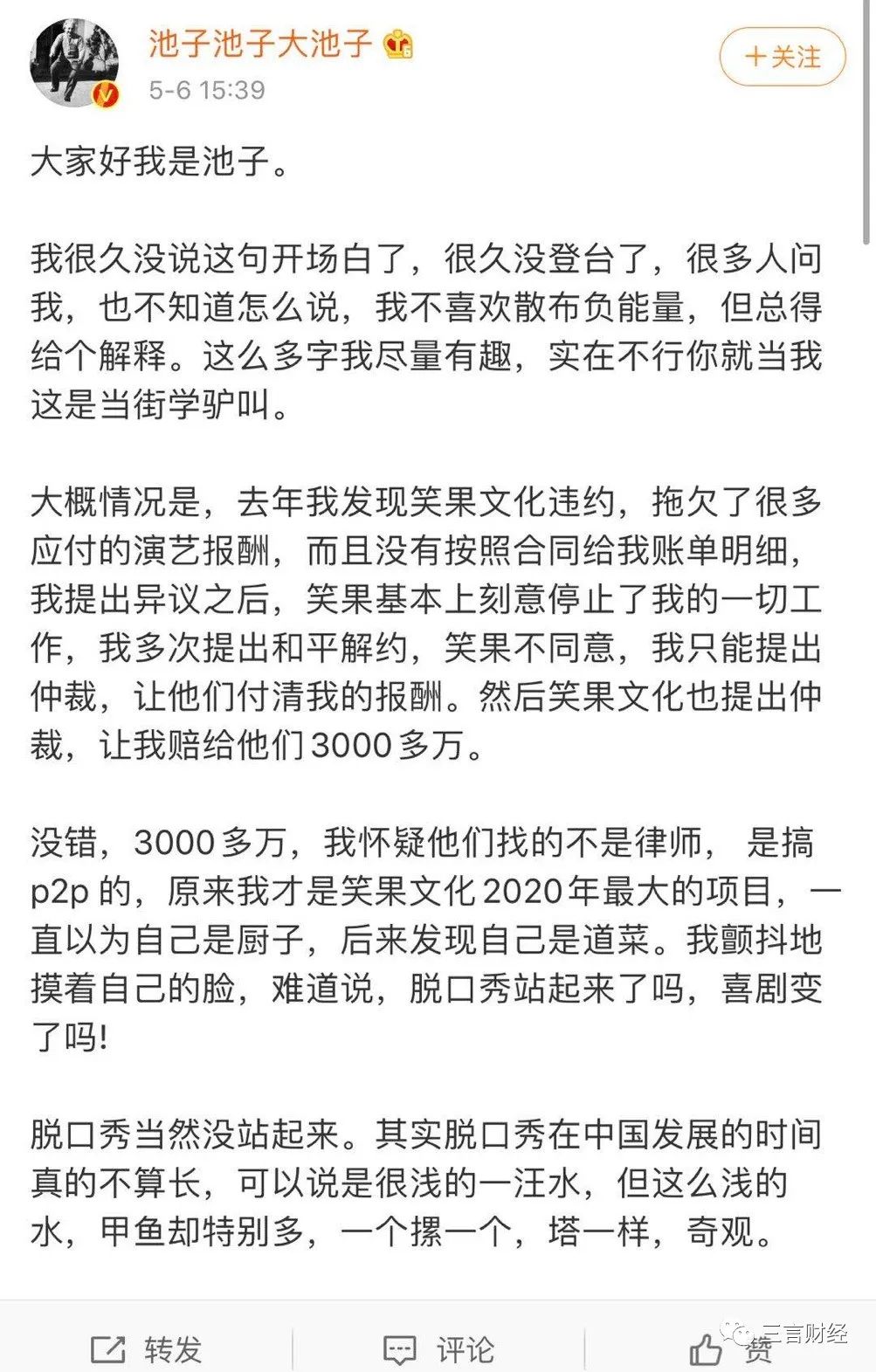 对于3000万的赔款池子笑称,原来自己才是笑果文化2020年最大的项目,一直以为自己是厨子,后来发现自己是道菜。“之前很多人离开笑果也是因为被伤得太厉害了,这一次,我更多的也是难过和无奈。”
