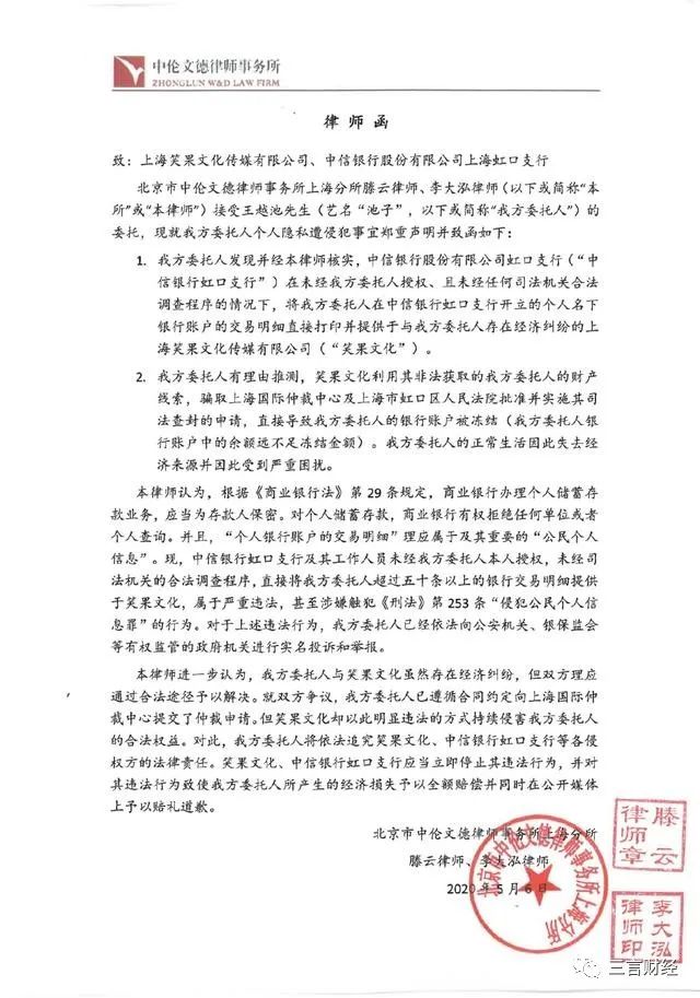 律师函显示,池子将依法追究笑果文化、中信银行虹口支行等各侵权方的法律责任。笑果文化、中信银行虹口支行应当立即停止其违法行为,并对其违法行为致使池子所产生的经济损失予以全额赔偿并同时在公开媒体上予以赔礼道歉。