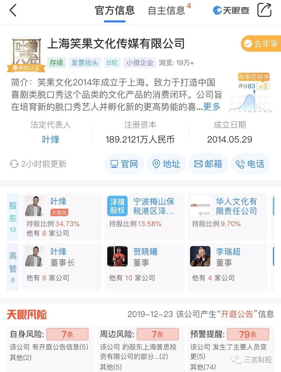 据天眼查数据显示,上海笑果文化传媒有限公司于2014年5月成立于上海,注册资本189.21万元,法定代表人叶烽,持股比例34.73%。