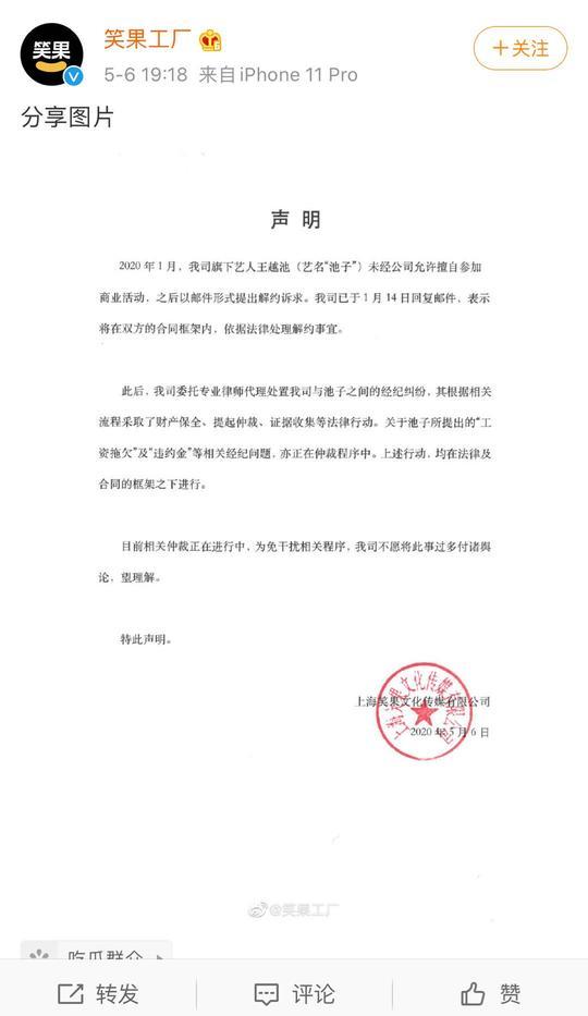 该公司表示将在双方的合同框架内,依据法律处理解约事宜,“关于池子所提出的“工资拖欠”及“违约金”等相关经纪问题,正在仲裁程序中,上述行动,均在法律及合同的框架之下进行。”