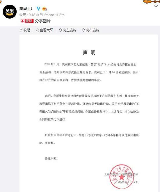 5月6日,池子再次发微博称,去年他发现笑果文化违约,拖欠了很多应付的演艺报酬,而且没有按照合同给他账单明细,在他提出异议之后,笑果基本上停止了他的一切工作。之后池子多次提出和平解约,笑果文化不同意,于是他只能提出仲裁,让对方付清其报酬。而笑果文化也提出仲裁,让池子赔给公司3000多万。