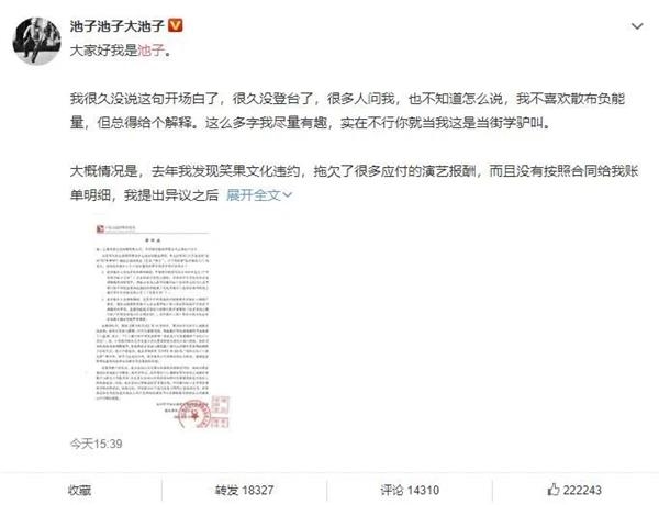 5月6日,池子再次发微博称,去年他发现笑果文化违约,拖欠了很多应付的演艺报酬,而且没有按照合同给他账单明细,在他提出异议之后,笑果基本上停止了他的一切工作。之后池子多次提出和平解约,笑果文化不同意,于是他只能提出仲裁,让对方付清其报酬。而笑果文化也提出仲裁,让池子赔给公司3000多万。
