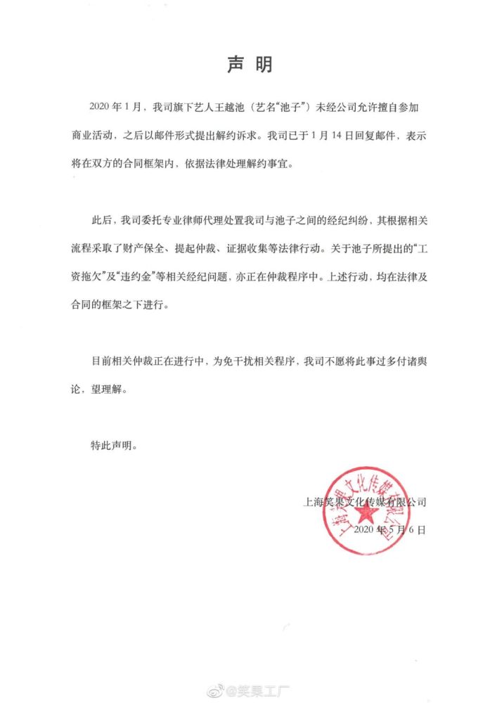 5月6日晚,上海笑果文化在微博上回应称,相关仲裁正在进行中,其“根据相关流程采取了财产保全、提起仲裁、证据收集等法律活动”,且上述行动“均在法律及合同的框架之下进行”。
