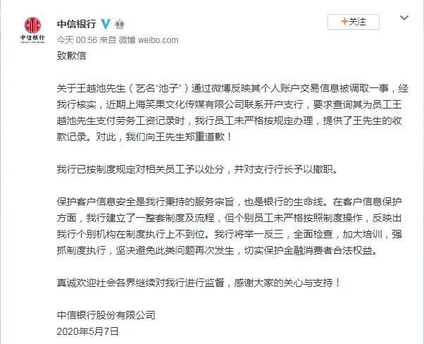 虎扑5月7日讯5月7日,中信银行官方微博向池子发布道歉信。中信银行称,我行员工未严格按规定办理,提供了王越池(艺名池子)收款记录。对此,向王先生郑重道歉!并已按制度规定对相关员工予以处分,并对支行行长予以撤职。微博发出后引起了网友的广泛讨论,详细内容如下: