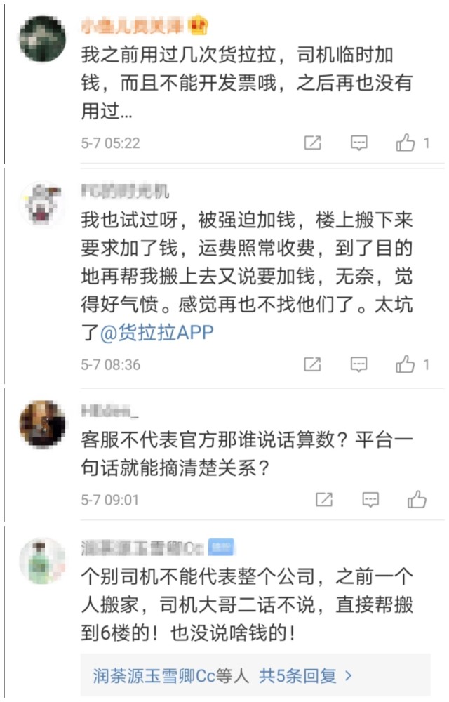 值得注意的是,有网友在微博评论区称也有过使用货拉拉被加钱的经历,“楼上搬下来要求加了钱,运费照常收费,到了目的地再帮我搬上去又说要加钱,无奈,觉得好气愤。”“之前用过几次货拉拉,司机临时加钱,而且不能开发票。”